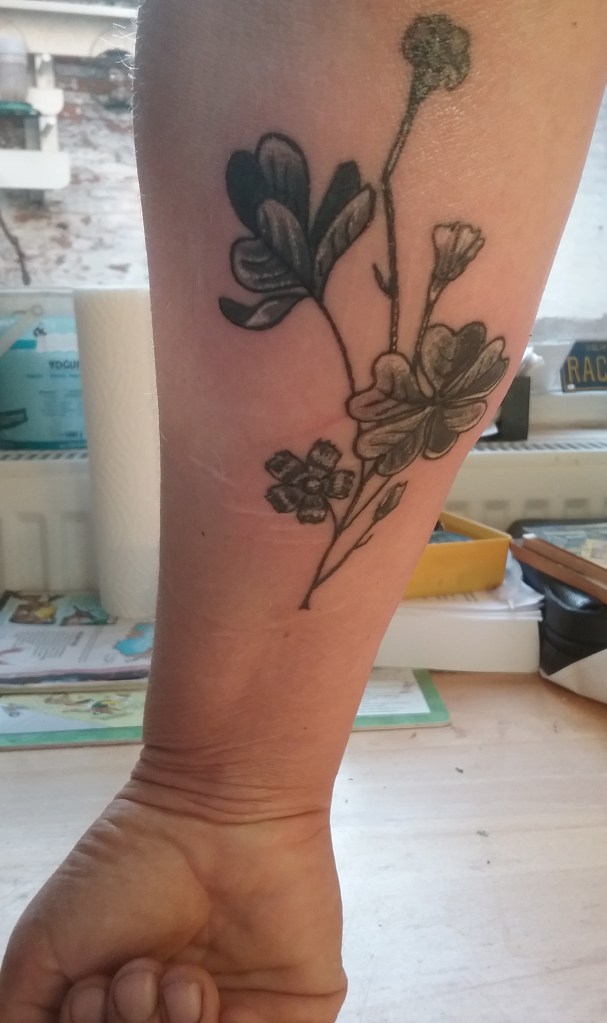 Normaal gesproken krijg ik altijd loon als ik op een uitvaart gespeeld heb, maar voor deze speciale en extra droevige gelegenheid wilde ik natuurlijk niks hebben. Voor mijn doppiemam was dat heel moeilijk; ik ben er schoorvoetend mee akkoord gegaan dat ze me mijn reiskosten zou vergoeden. Toen ik thuis het envelopje openmaakte, bleek daar veel meer dan alleen reiskostenvergoeding in te zitten. Ik wilde absoluut niet dat dit geld in de huishoudpot ging; ik wilde er iets bijzonders mee doen als herinnering aan Hen en als teken van de onvoorwaardelijke liefde die ze mij hebben laten voelen en ervaren. Dus ik ging naar mijn tattoo-artist en heb een klavertje vijf laten zetten op mijn rechteronderarm.