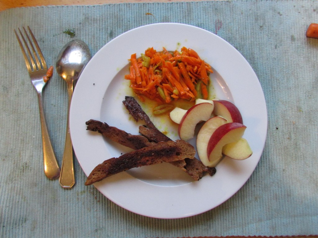 Soms bak ik gewoon een paar stukjes seitan in wat margarine als ontbijt. Vandaag had ik daarbij een restje wortelsalade en een appel.