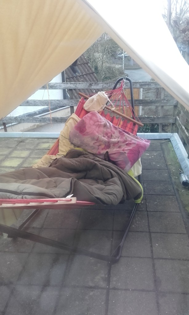 Gisteravond woei het best hard. Eigenlijk te hard om in de hangmat te gaan slapen…..of toch niet. Terwijl ik nog aan het twijfelen was, overtuigde Henk mij dat ik toch gewoon buiten kon gaan liggen en als het niet ging, ik weer naar binnen kon komen. Dus heb ik om een uur of half twaalf in een luwte mijn hangmat opgehangen en opgemaakt en voor twaalven lag ik erin. Maar de wind had ervoor gezorgd dat mijn bed niet zo glad was als anders en ik kon maar niet lekker liggen. Na een hoop gerommel en getrek aan slaapzak, isolatiematje, pyjama en hangmat viel ik uiteindelijk toch in slaap. In mijn hoofd de gedachte dat ik toch echt een prinses op de erwt ben 🙈
