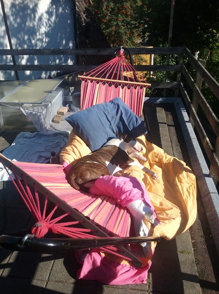 Laatst lag ik, samen met Reinier in de hangmat en mijn boek was uit. Ik was te lui om op te staan om een nieuw boek of mijn e-reader te gaan pakken (ik had een heus papieren boek van mijn zus geleend) en ik lag dus een beetje dromerig Reinier te kriebelen en hij liet allemaal haren los. Logisch natuurlijk, want hoewel bulletjes maar een dun jasje aanhebben verharen ook zij wanneer het weer warmer wordt. Ik haalde hele polletjes haar van zijn vacht en gooide die naast de hangmat op de grond. Onmiddellijk kwamen er musjes aan die de polletjes haar oppikten en meenamen in hun snavel. Ik neem aan dat er nu een mussenfamilie lekker warm in een nestje vol met Reiniers haren slaapt. ❤