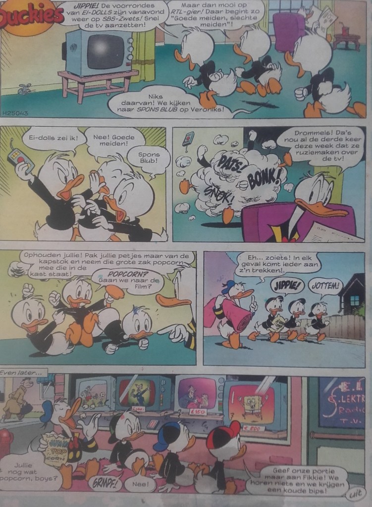 Ik las een oud stripje van Donald Duck. Niet zo oud als ik dacht (2005). Dit grapje zou nu niet meer gemaakt kunnen worden. Gewoon omdat tegenwoordig iedereen zijn eigen apparaat heeft om af te spelen wat, wanneer en waar je maar wilt.