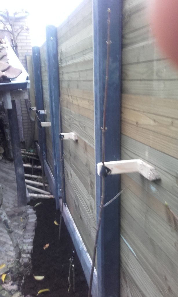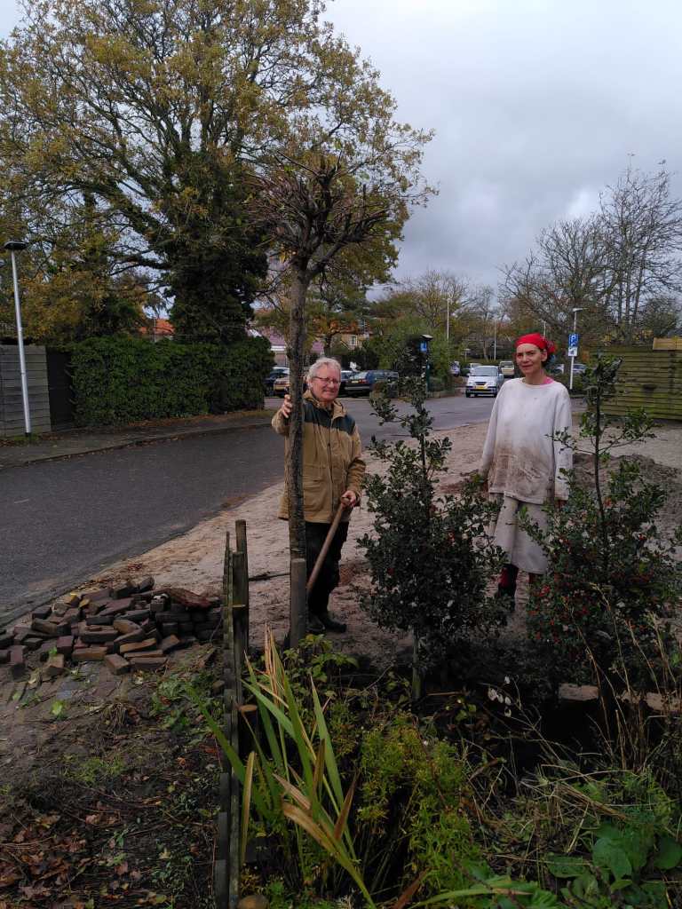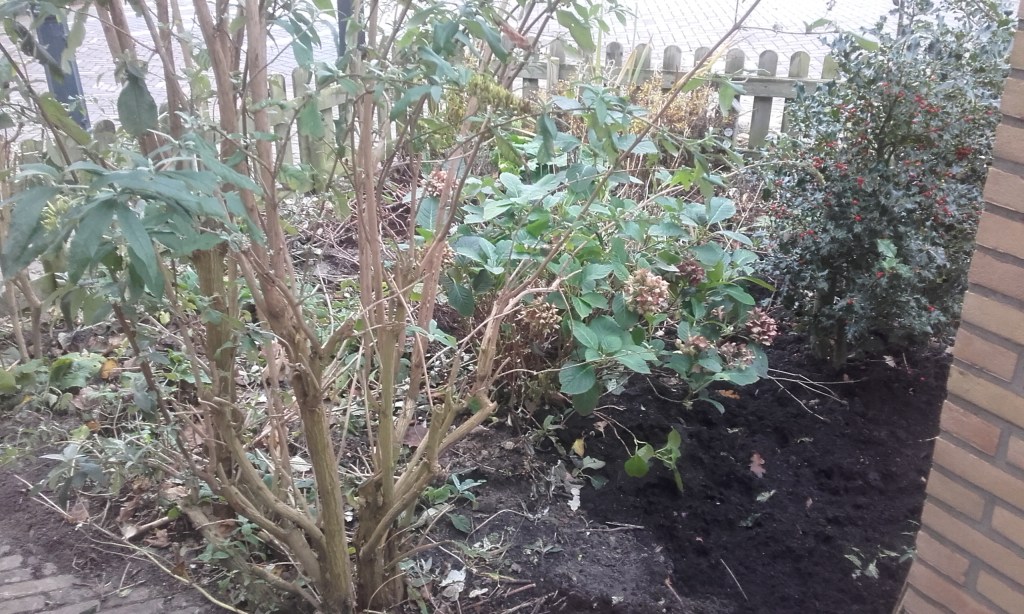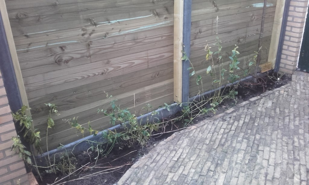 De gemeente laat ons nog steeds in de rommel zitten en laat niks van zich horen. Ze hadden zoveel haast het pand naast ons te slopen; nu het al een week of zes plat ligt en er nog steeds HE-LE-MAAL niets is gebeurd, vraag ik me toch stellig af waarom ze zo een haast hadden? Eigenlijk viel het met die haast ook wel weer mee. Eerst wilden ze slopen in week 1, toen werd het week 10 en uiteindelijk is het pas in week 40 tegen de grond gegaan. Ons dak is nog niet geplakt. De pilaar is nog niet afgedekt. De grond naast ons huis waar een fietsenstalling moet komen ligt nog steeds braak. We horen niks. We leven in onzekerheid….maar ondanks mijn slechte dispositie heb ik evengoed de overtuiging dat je nimmer het heden mag opofferen voor een toekomst die misschien nooit komt en dus hebben we gewoon een nieuw hek geplaatst om onze voortuin en hebben we bomen geplant (1 els, 9 esdoorns, 2 hulstbomen) en struiken (winterjasmijn en 9 klimrozen in diverse kleuren en flox) en gister heb ik bollen geplant (100 gemengde tulpen en 22 blauwe hyacinten) Henk heeft een betonnen paal geplaatst waar straks mijn hangmat (en de tarp) aan komen te hangen.