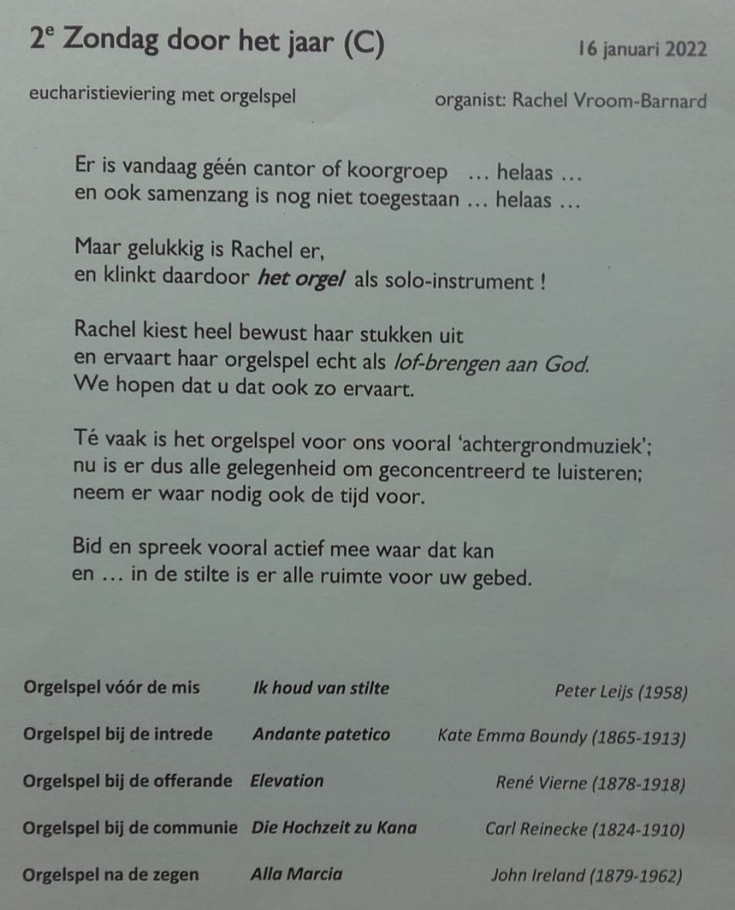 In de kerk aangekomen lag er een briefje van de cantor en een liturgieboekje voor me klaar op de orgelbank. Veel plezier en devotie, stond erop. Ik pak mijn muziek, trek mijn orgelschoenen aan en bestudeer het misboekje. Tranen van ontroering stromen over mijn gezicht, wat een mooi en lief gebaar!