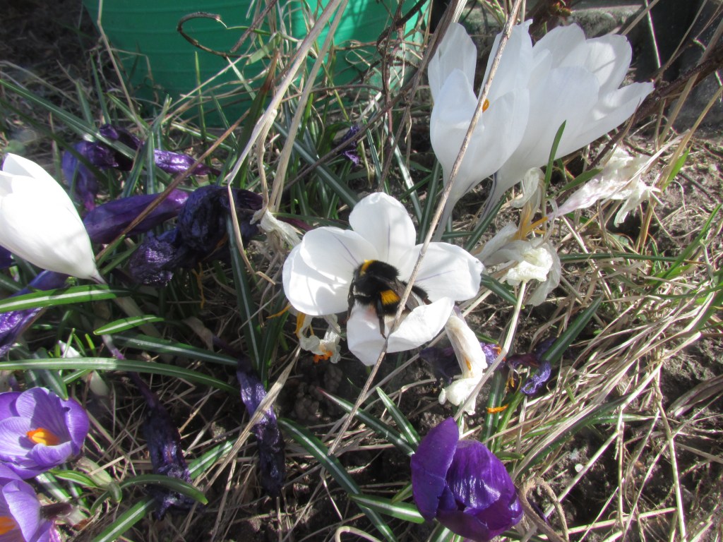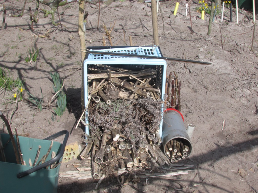 Ik had een kratje, een steen met gaatjes en een stukje rioolbuis gevonden op de bouwplaats naast het moestuinencomplex en een berg zonnebloemstelen van vorig jaar en nog wat ander vulmateriaal op de gezamenlijke composthoop. Henneptouw, de grondboor en een zaag haalde ik allemaal uit onze gereedschapskist. In de gereedschapskist overigens zitten nog vier poppen van (waarschijnlijk) het groot koolwitje. De wespenkoningin is op 10 maart uitgevlogen. Ineens was ze weg! Ik hoop dat ik het uitkomen van de poppen niet mis. Ik hoop dat ik er een filmpje van kan maken…