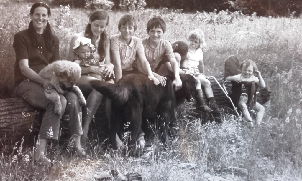 mijn zus en ikvan links naar rechts: broer, ik, zus, zus, broervan links naar rechts: moeder met pup Brit, tante met broer, broer, broer, zus (wil niet op de foto), zus en ik in de rugzak. De zwarte hond voor de stam is Patroet, moeder van Brit.
